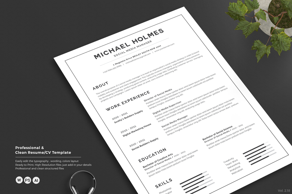 This professional Resume Template is made in Adobe Photoshop, Illustrator and MS Word aka Microsoft Word. This simple/clean Resume Template is professionally organized and labelled so every beginner can edit it like a pro.