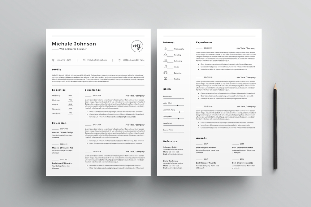 This is a complete resume ever. It includes all the sections you have ever need to mention in your job cv. You have extended page to mention you experience, portfolio page to show your work/portfolio and many more like - skills, interests, references, languages etc.