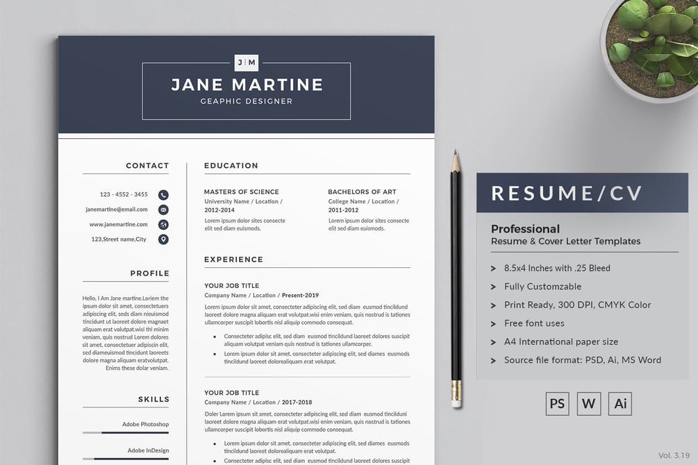 This professional Resume Template is made in Adobe Photoshop, Illustrator and MS Word aka Microsoft Word. This simple/clean Resume Template is professionally organized and labelled so every beginner can edit it like a pro.